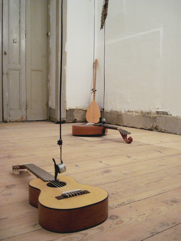 acoustic strings instruments, cable and computer controlled motors.For two rooms. in two different tunings.
